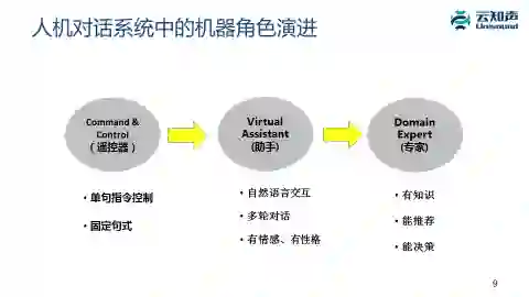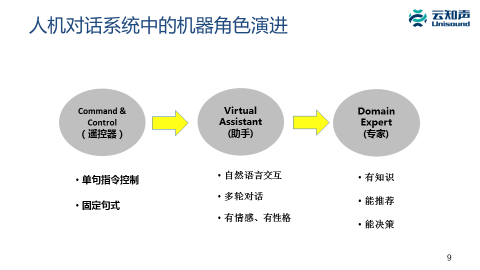 但是下一个阶段是它会变成专家的角色,特别是面向行业或者特定领域时,当我们跟音箱对话时,希望这个音箱同时也是一个音乐专家,它可以跟你聊音乐的问题,可以跟你聊古典音乐,甚至教你一些音乐知识。我们跟儿童教育机器人对话时,希望这个机器人是一个儿童教育专家,我们跟空调对话时希望后面是个空调专家。这时它的特点是需要有这个领域的知识,而且能够帮你做推荐、做决策。