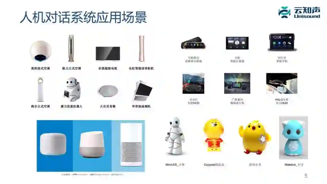 另外一个应用领域是儿童教育机器人,右下角这些各种形状的儿童机器人,实际上可以看成儿童版的音箱,它的内容是面向儿童的,但是交互形式也是人机对话的方式。