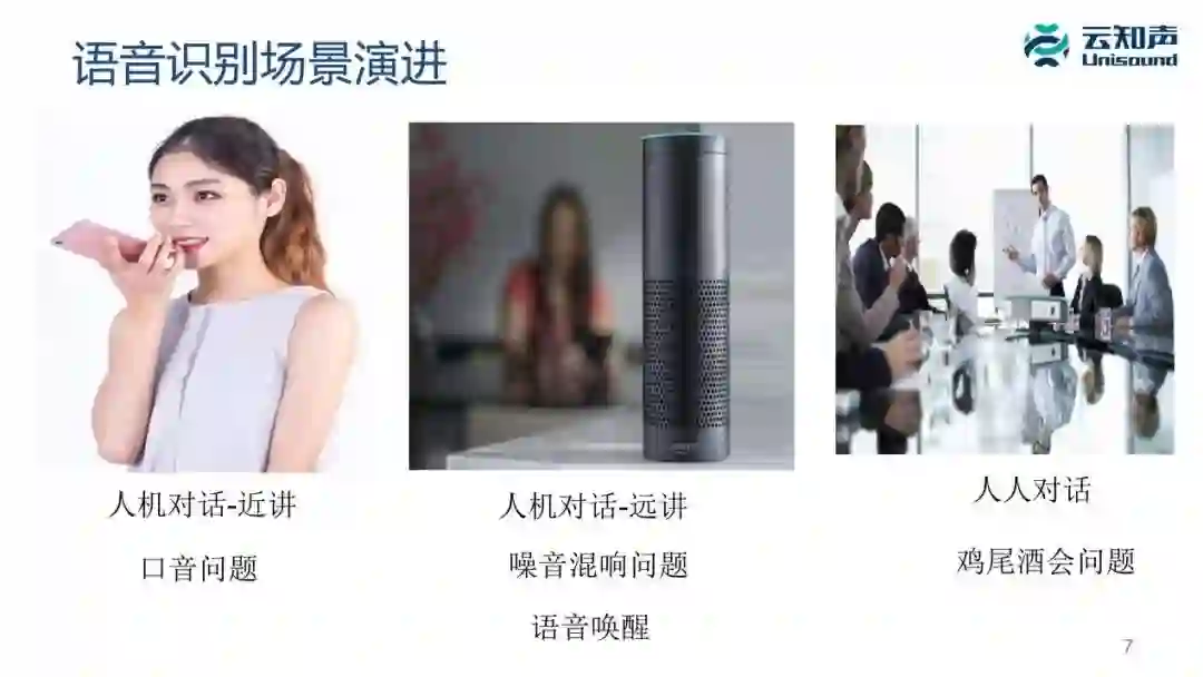 最早像 Siri 这样的场景是近讲模式,它最主要解决的问题是口音问题,目前这方面的识别准确率非常高,已经能做到 97% 左右,大家平时用的手机语音输入法就是这种模式,一般建议离麦克风的距离是30cm左右。