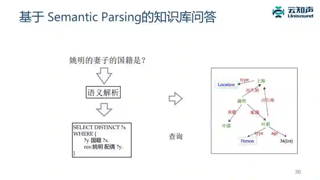 知识问答主要有两种方法:一种是基于 Semantic Parsing 的传统方法,它是把一个问题解析成一个形式化的查询语言,再把查询语言知识库里面做查询。这个方法的最大难点是把自然语言的问题转成这样一个形式化的查询语言。同样也有很多方法,最简单的基于规则、基于模板,复杂点的基于翻译模型、基于深度学习模型等。