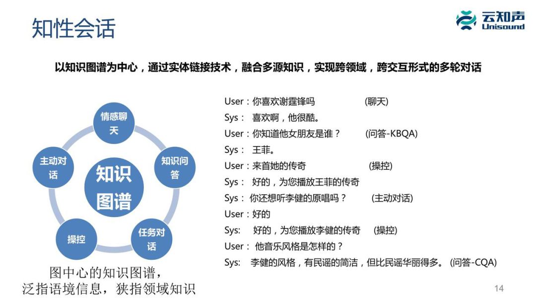 你看这个例子的话,它涉及很多跟音乐相关的知识,还包括一些歌星的人物相关的知识。交互形式有聊天、问答、操控、主动对话,是通过知识把它们关联在一起,你会感觉整个对话是个很流畅的对话。