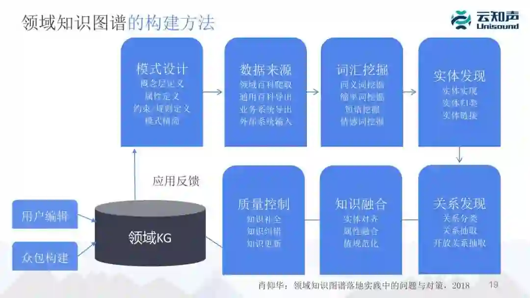 最后,对知识图谱的质量做检查控制,包括知识的补全,有错的话要纠错,还有知识更新,最后形成一个领域的知识图谱。