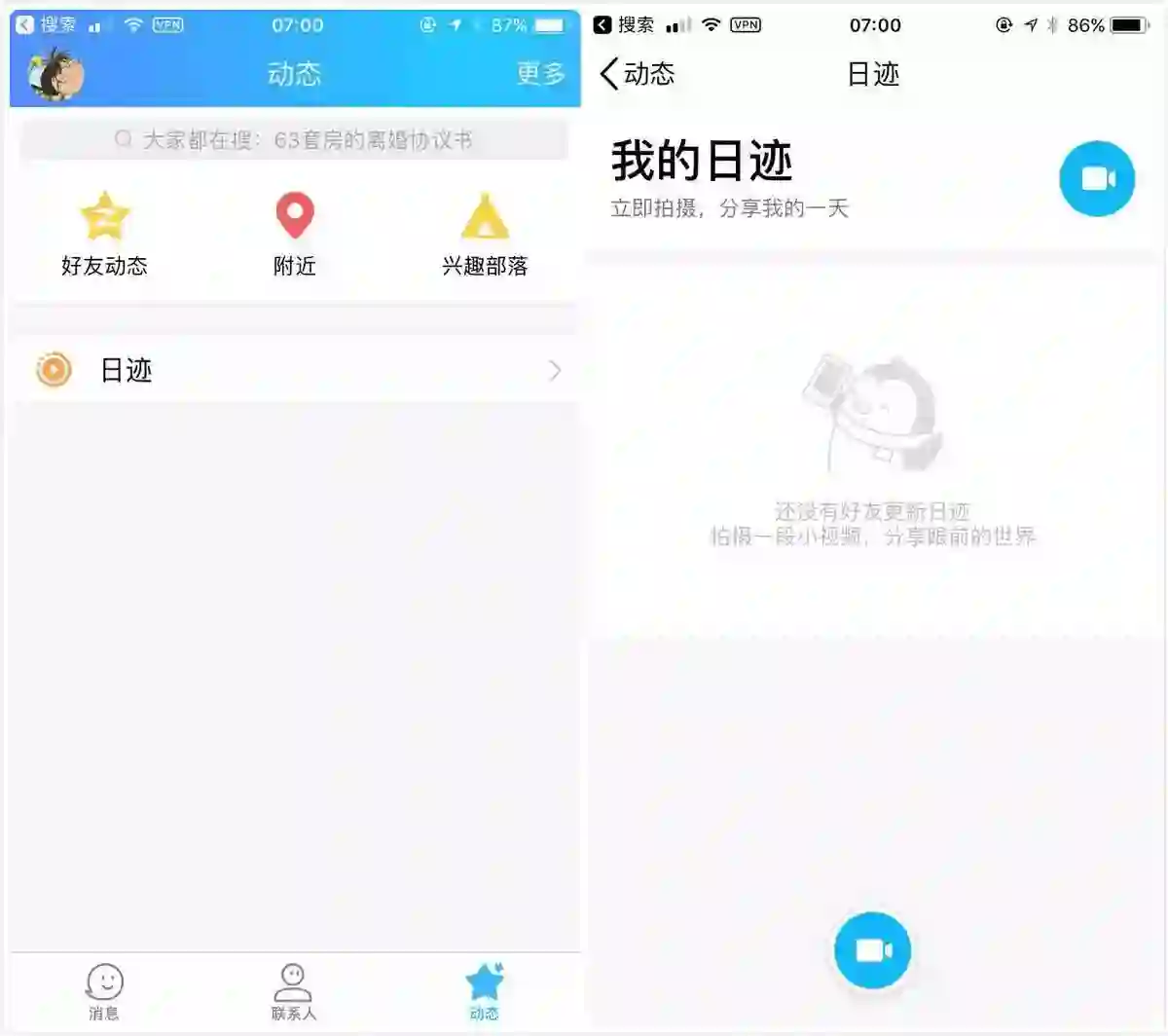 再仔细数数,QIM 底部的入口就三项,聊天、相机以及日迹——也就是 QQ 自己的短视频入口。