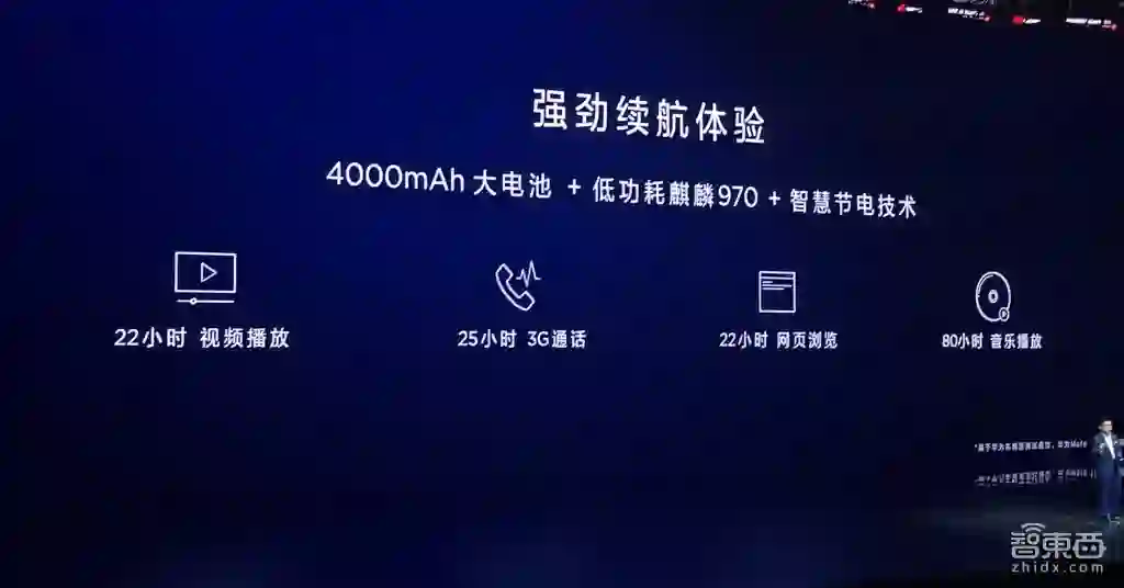 长续航方面,Mate 10系列比Mate9系列提升30%,可以满足重度用户使用1天、轻度用户使用约2天的。这首先得益于配备的4000mAh大电池,再加上低功耗处理器。