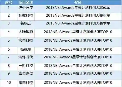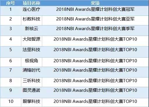 在决赛上,21个项目经过激烈的角逐以及50余位一线知名基金投资人和产业专家的多维度评审和投票,最终10个项目脱颖而出,分别荣获了“面向未来 2018 NBI Awards 星耀计划科创大赛”的冠、亚、季军和十强。