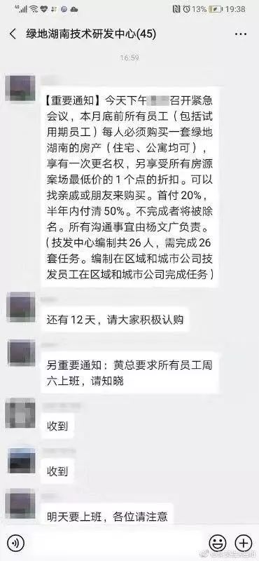 近日,网传一张绿地湖南事业部技术研发中心的微信群截图。有员工反映,绿地湖南事业部要求部门内所有员工(包括试用期员工)必须在月底前购买一套绿地湖南的房产(也可以找亲戚或朋友来购买),住宅、公寓均可,享有一次更名权和所有案场最低价1个点的折扣,首付20%,半年内付50%,“不完成者将被除名”。
