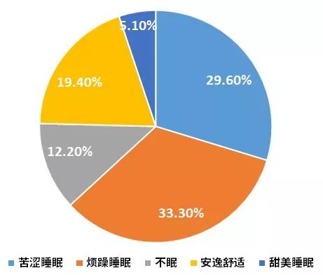 《研究》显示,90后的睡眠均值为66.26分(满分100分)。被调查者普遍睡眠不佳,呈现出“需辗转反侧,才能安然入睡”的状态。“苦涩睡眠”占29.6%,“烦躁睡眠”占33.3%,“不眠”占12.2%,“安逸舒适睡眠”占19.4%,只有5.1%的人睡眠处于“甜美睡眠”。