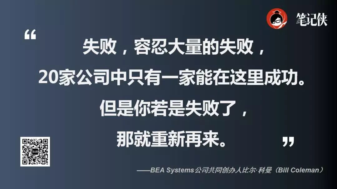 科曼认为,硅谷的秘密是:“失败,容忍大量的失败,20家公司中只有一家能在这里成功。但是你若是失败了,那就重新再来。”
