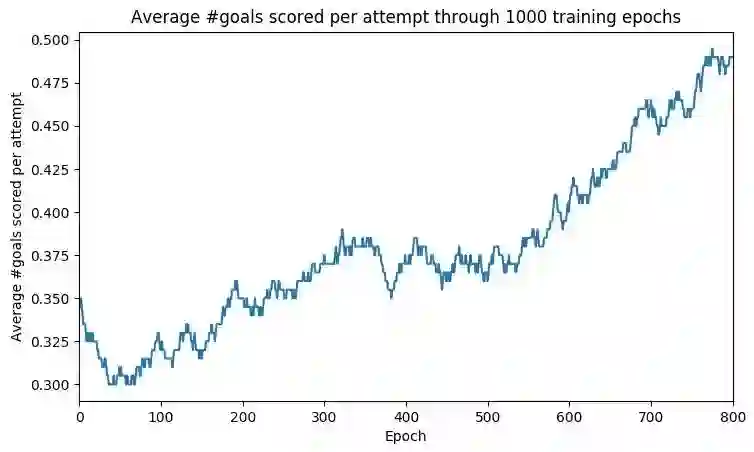 上图显示在 1000 个 epoch 中每次尝试的任意球平均数。因此,例如 epoch 700 的值为 0.45 意味着(平均)45% 的尝试需要罚球。如上图所示,在训练 1000 个 epoch 后,平均射门得分率从 30% 上升到 50%。这意味着当前机器人在一半数量的任意球尝试中成功得分(而人类的平均得分率是 75-80%)。不过 FIFA 的比赛并不具备那么强的确定性,使得学习过程变得困难。