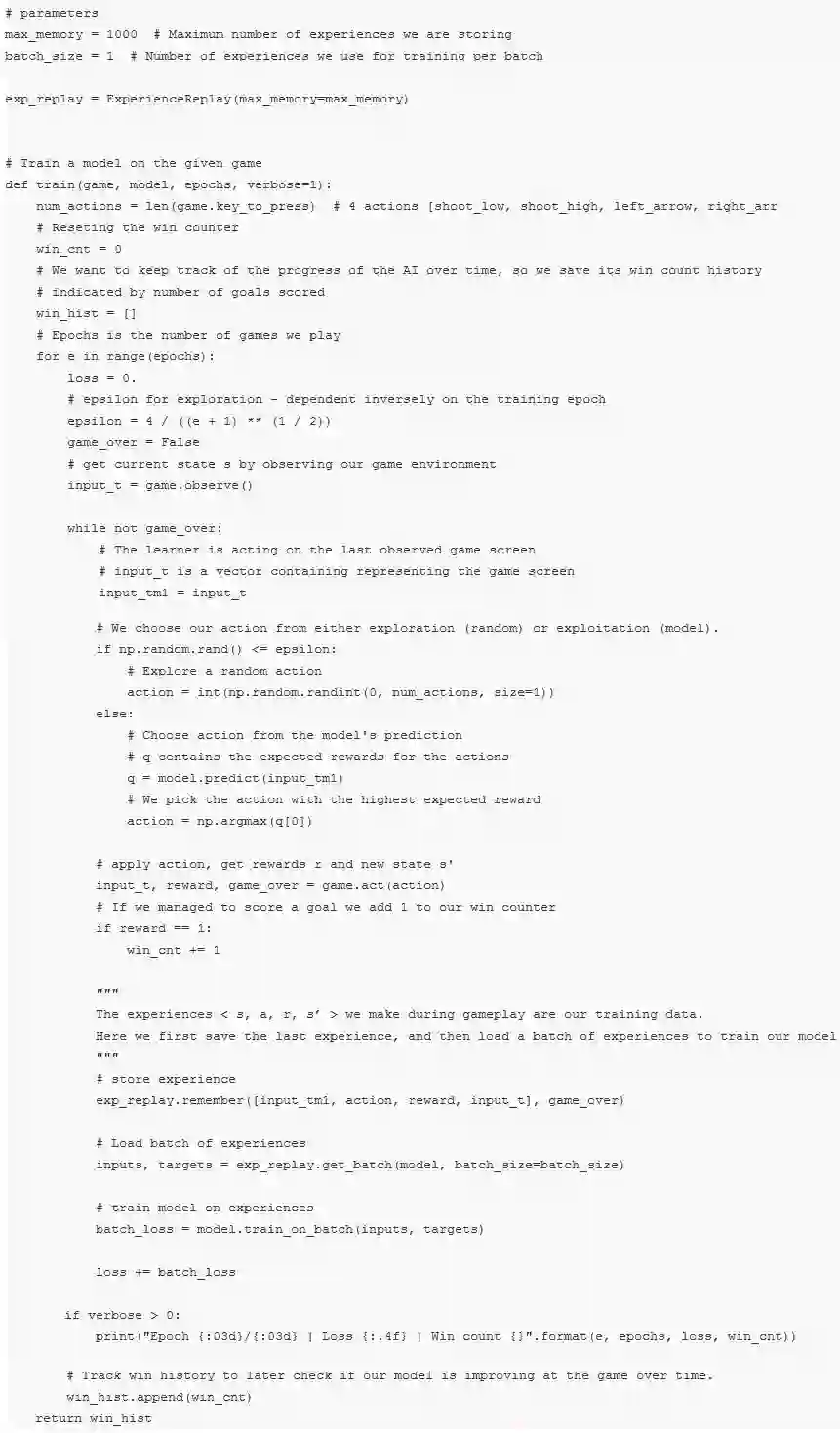 现在我们可以与游戏互动,并将互动储存在记忆中。我们开始训练 Q 学习模型。为此,我们将在「探索」(exploration,在游戏中随机采取动作)和「利用」(exploitation,采取模型预测的动作)之间取得平衡。这样我们就可以通过试错来获得不同的游戏体验。参数 epsilon 正是用于此目的,它是平衡 exploration 和 exploitation 的指数递减因子。开始的时候,我们什么都不知道,想进行更多探索,但是随着 epoch 的增加,我们学到的越来越多,于是我们想多利用,少探索。因此参数epsilon 的值衰减。