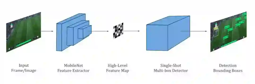 为了令智能体能理解输入图像,我们使用了一个非常紧凑的轻量级卷积网络,即 MobileNet。该网络抽取的特征图表征了智能体对图像的高级语义理解,例如理解球员和其它目标在图像中的位置。特征图随后会与单次多目标检测器一起检测球场上的球员、球与球门。