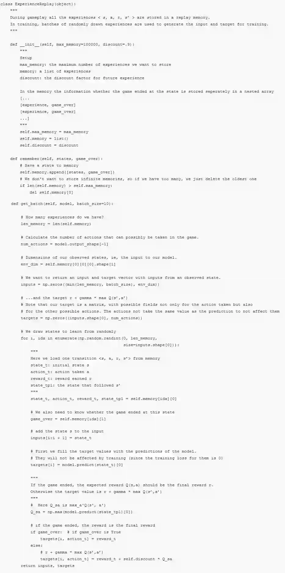 在整个训练过程中,我们要储存所有的经验和观察到的奖励,并以此作为 Q 学习模型的训练数据。所以,对于我们采取的每一个动作,我们都要将经验 <s,>与 game_over 标志一起存储。我们的模型将尝试学习的目标标签是每个动作的最终奖励,这是该回归问题的实数。