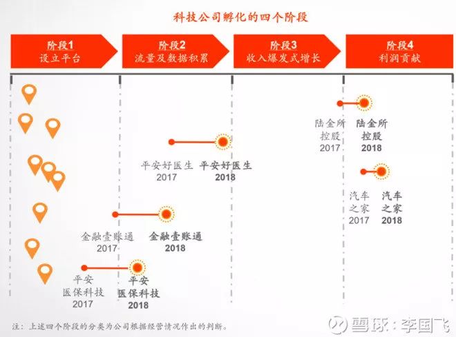 平安金融科技主要包括陆金所、平安好医生、金融一帐通、平安医保科技,汽车之家这五家公司,这五家公司发展都很迅猛,如果把盈利阶段分为设立平台、流量及数据积累、收入爆发式增长及利润贡献四个阶段,这五家公司分别处于以下阶段: