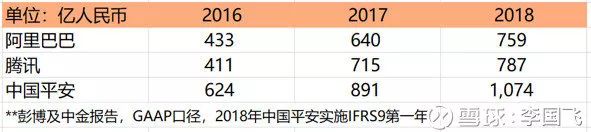 2016年,平安净利润624亿,超过了阿里和腾讯的433亿和411亿;2017年,平安净利润891亿,超过了阿里和腾讯的640亿和715亿;2018年,平安净利润1074亿,超过了阿里和腾讯的759亿和787亿,平安连续完胜三年。