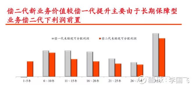 偿二代还带来一个重大变化,就是新业务价值前置,由此带来的利润也将前置,下面这张图反映了这一变化,通俗来说,以前(偿一代)卖长期保障型产品,第一年这项业务往往是亏钱的,前面五年,会计上反应也往往是亏钱的,偿二代后,第一年,还有前面五年会计反应一般都是赚钱的。