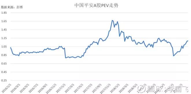 下图是自2016年后平安的PEV(EV用当年值计算,2019年的EV按预测增长20%计算)曲线,平安PEV曾在2017年1月达到最低约0.8倍,2018年1月最高达到约1.65倍。最新平安A股价80.44元(4月12日收盘价,后面的计算都基于这个价格)预测2019年的PEV是1.21倍。