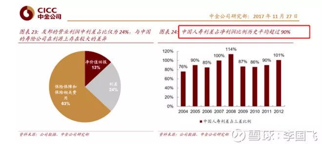 很明显,友邦的PEV和美国国债收益率相关性比较小,它是怎么做到的?友邦产品中NBV死差费差占比高达80%左右,EV死差费差占比高达75%--80%,所以它的业绩受利率的影响就很小,分析师很喜欢,给它的PEV估值长期在2倍多。中国几个大的保险公司估值一直很低,除平安之外现在还是0.8倍左右,如果用EV+NBV*N公式给它们估值,N居然是负的,个中原因很多,但最核心的原因是业绩受利率影响太大了。下图来自中金公司在2017年11月底的一份报告,显示友邦的营业利润中利差占比仅为24%,而中国人寿利差占净利润比例历史上平均超过90%,除平安外的几家大保险公司近年来都在积极转型,提升长期保障型产品的销售比重,也都有进步,但是效果还不算太显著。平安这方面和友邦还有不少的距离,但进步很大,增速很快,我估计再过四五年,死差费差占NBV和EV的比重有望接近友邦。