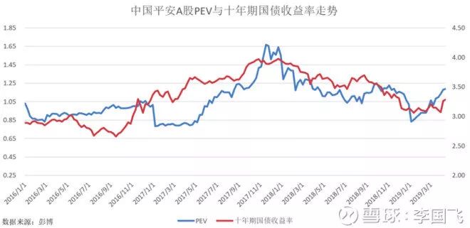 利率趋势对平安估值影响一直比较大,在利率由低往上走的过程,估值容易提升,而利率由高往下走的过程,情况则相反。两者的相关性可见下图,可见相关性还是比较强的。