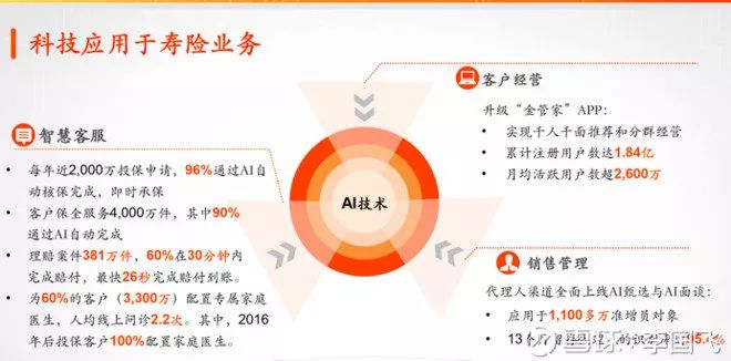 在金融服务领域,平安人工智能技术已涵盖智能预测、智能风控和智能服务等领域,为客户提供快速理赔、智能双录、中小型企业贷款审批和智能客服等功能。在智能风控领域,平安通过端到端线上化的微表情面审风控系统,与人工审核的匹配度近90%,可节约近40%的人力成本。平安的各项业务都在大规模应用集团高科技研发的成果,显著提升了工作效率和竞争力,以寿险业务为例,具体见下图的介绍。