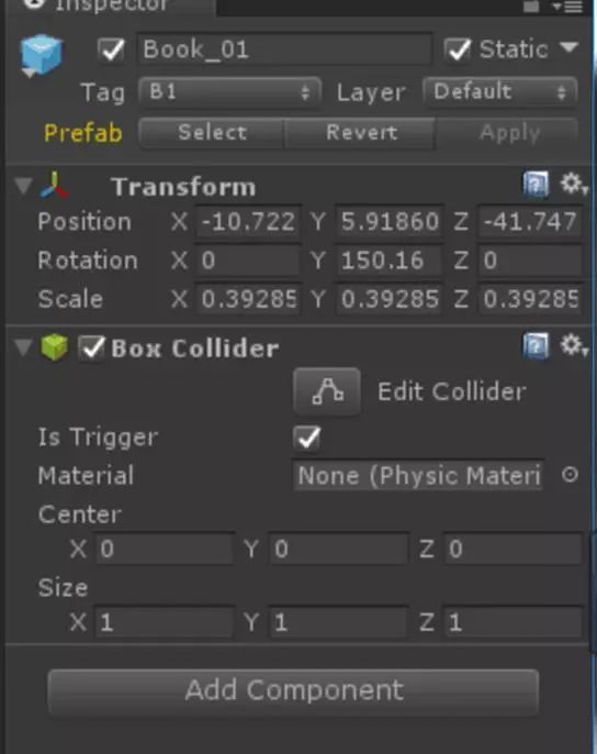 然后为了让它能够和玩家物体发生交互,我们将为它添加一个原型碰撞器。点击菜单Component——Physice——Box Collider 因为我们不希望玩家在收集它的时候突然撞上去然后停止运动,所以我们将它的碰撞器设置为触发模式,在组件中勾起Is Trigger。
