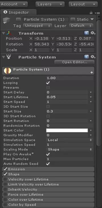 首先导入枪支模型,为了增加真实性。在枪口位置设置一个子物体,其子物体展示粒子效果(GameObject——ParticleSystem)其粒子效果充当火焰特效。