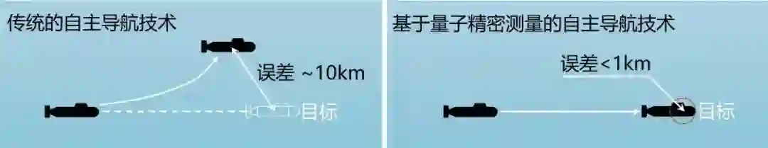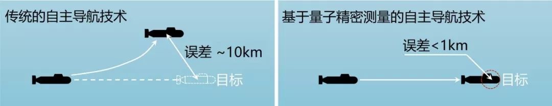 量子精密测量可以大幅度提升导航、激光制导、水下定位、医学检测和引力波探测等的领域研究的准确性和精度。例如水下自主导航,传统导航技术在航行100天后定位误差达数十公里,需要定期上浮利用卫星定位修正;而利用量子精密测量技术,航行100天后定位误差小于数百米,不需卫星定位修正,可长期潜伏。