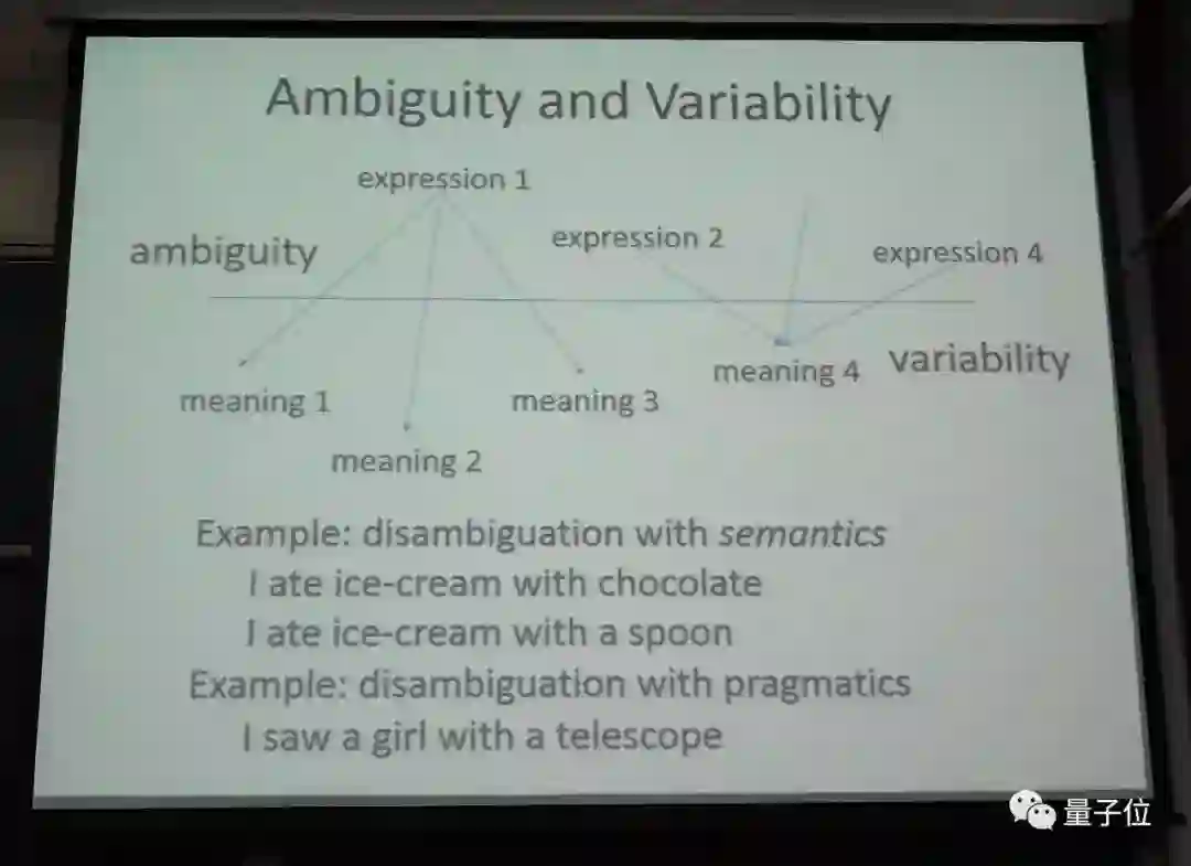 这里面还有一个重要的点,我们理解一个语言的意思,还需要上下文,只有在上下文里才能真正理解语义。所以语义处理,语义分析可以认为是这样的处理:听到一段话或者看到一段文字,就是语音的符号和文字的符号,我们要把它映射到大脑的一个表示上面去,这个映射是一个多对多的映射,是一个非常复杂的事情,造成了多义性和多样性。