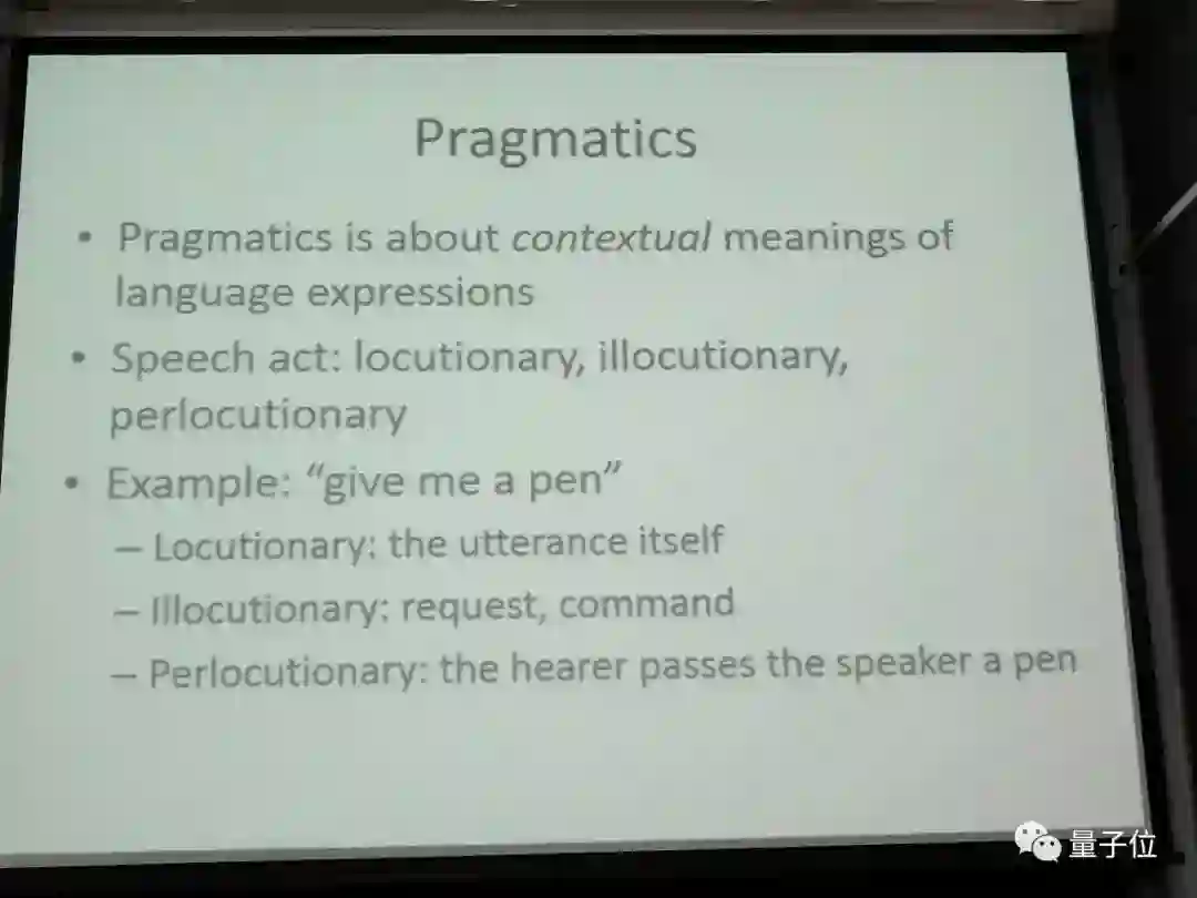 语用也是非常复杂的,同样说一句话,比如这个房间很热,语义上就是这个意思,但是也可能是我想说希望你把窗户打开,这可能是我在语用上想表达的东西,只有在上下文里面才能够体会到句子的意思。