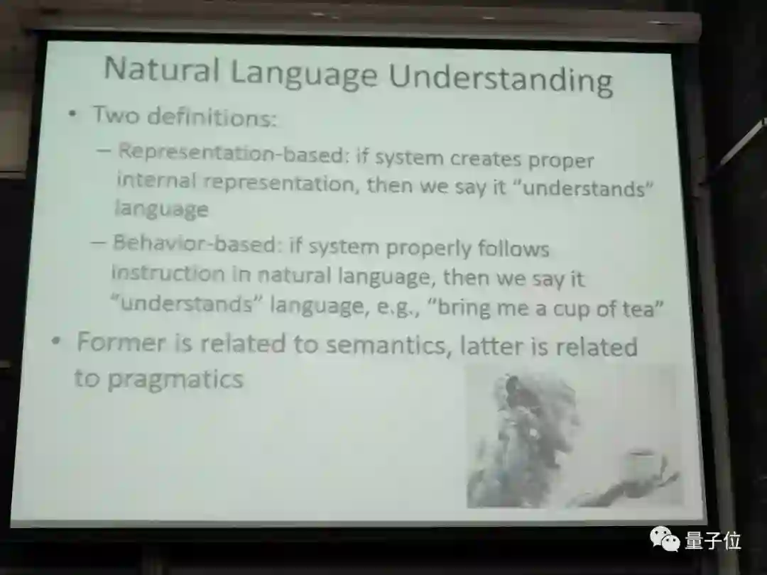 另外一种是基于行为,比如有人说,给我拿一杯茶,机器人做了这个行为,我们就认为它是基于行为地理解了人的语言。这两个定义在一定程度上有一些互补,前者更多的是语义处理,后者更多的是语用处理。