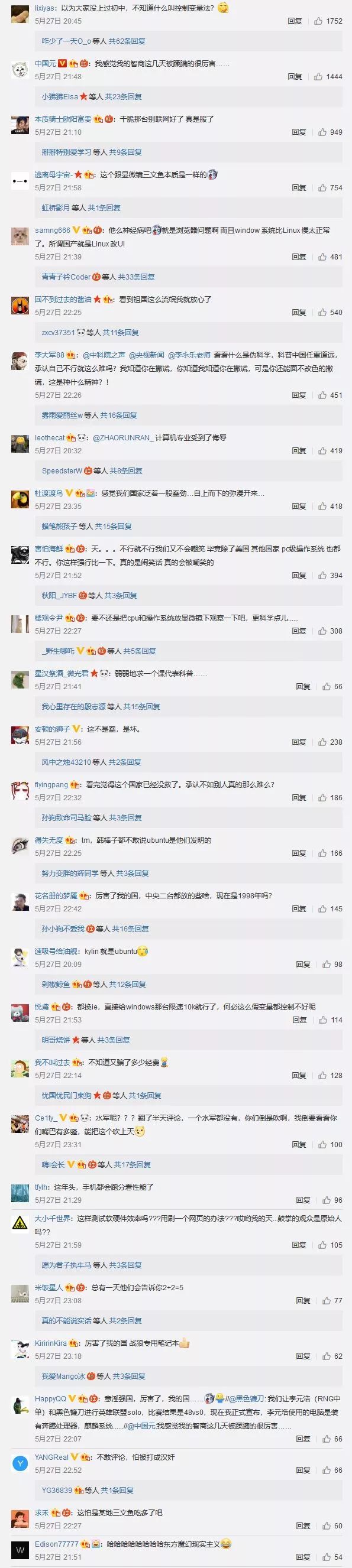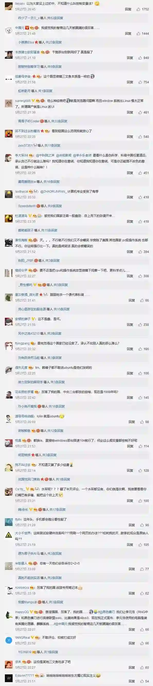 在社交网络上,很多用户对这次对比表示质疑。有用户表示“以为大家没上过初中,不知道什么叫控制变量法?”,还有用户表示:“看看什么是伪科学,科普中国任重道远,承认自己不行就这么难吗?我知道你在撒谎,你知道我知道你在撒谎,可是你还能面不改色的撒谎,这是种什么精神?!”;还有用户表示:“天。。。不行就不行我们又不会嘲笑 毕竟除了美国 其他国家 pc级操作系统 也都不行。你这样强行比一下。真的是闹笑话 真的会被嘲笑的”