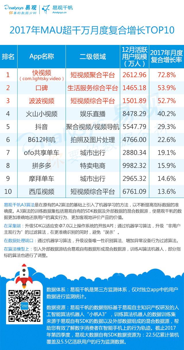 成长、成熟是人的进步,在流量竞争向存量用户运营转变的互联网下半场,增速则是移动互联网新物种和独角兽成长的数字见证。进入年终盘点季,除了2017年度App排行榜,还有年度TOP增速榜。根据易观千帆数据,我们特别制作了《2017年度千万级MAU增速榜TOP10》。