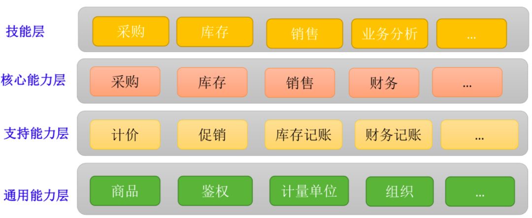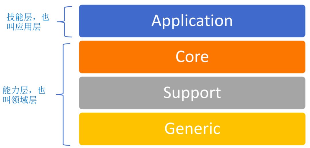 我们抽取像产品、计量单位、组织等能力域后,再把这些能力进行分层,像应用层,还有领域层。领域层包括核心层、支持层、通用层。核心层包含核心领域服务,一般是业务人员可感知的,一般映射为具体业务部门;支撑层包含支持一般是支持业务的某一方面的能力服务;通用层包括一些公共能力服务,例如产品、计量单位等。