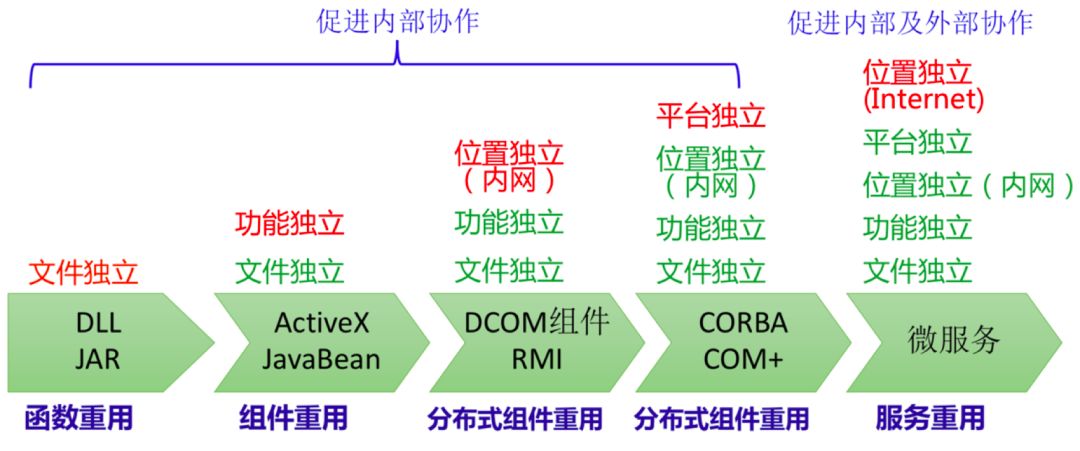 随着函数越来越多,查询和使用共享功能变得复杂,我们就把类似的函数、功能有机组合在一起,封装成所谓的组件,也就是Windows平台的ActiveX组件和JAVA平台的JavaBeans组件,这也就是我们通常说的组件重用。该种技术要求调用者和被调用者必须在一个机器和进程上,使用上受到位置的约束。
