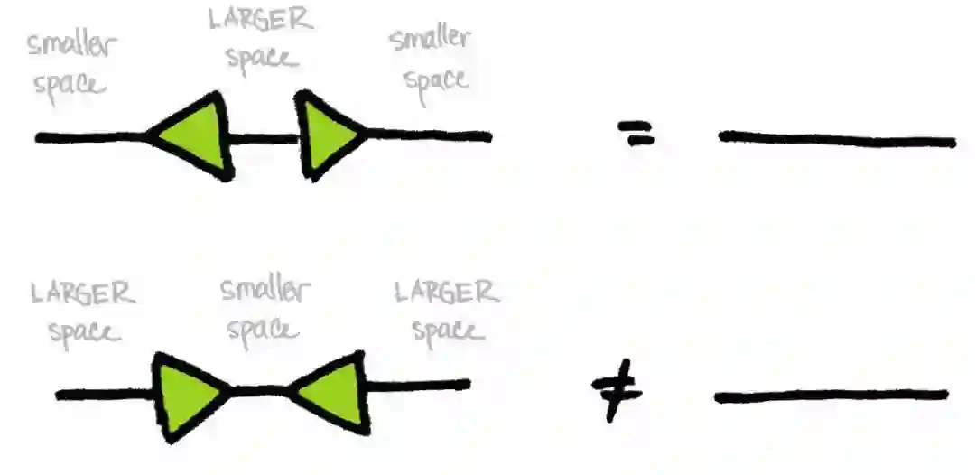 等距嵌入 U 是从空间 V 到更大维度空间 W 的线性映射,它保留了向量的长度。这样的图满足 U^⊤U=id_v,但 UU^⊤≠id_w。换句话说,你可以将小空间 V 嵌入到大空间,然后再投影回 V 中,而不扭曲 V 中的向量(与拓扑中的回缩映射(retraction map)不同)。但是将所有的 W 都压缩到小 V 上后,你不能指望在将 V 转回 W 的过程中修复损坏。三角形暗示了这种大与小的特征。(三角形的底边比它的尖端大!)一般来说,如下图所示,单位线性算子被画成直线:
