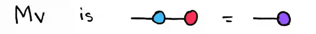这让我想起雨水从窗户滴下来:当两个雨滴接触时,它们融合成更大的雨滴。这是矩阵乘法。对于矩阵向量乘法,也有类似的情况:一个矩阵 M 乘以一个向量 v,得到另一个向量 Mv,它是一个具有一个自由边的节点。