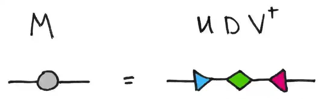 这里,U 和 V 是一元矩阵,所以是等距矩阵,也是三角形。矩阵 D 是一个对角矩阵,我喜欢用一个菱形来表示。总之,矩阵分解是将一个节点分解为多个节点;矩阵乘法是将多个节点融合为一个节点。