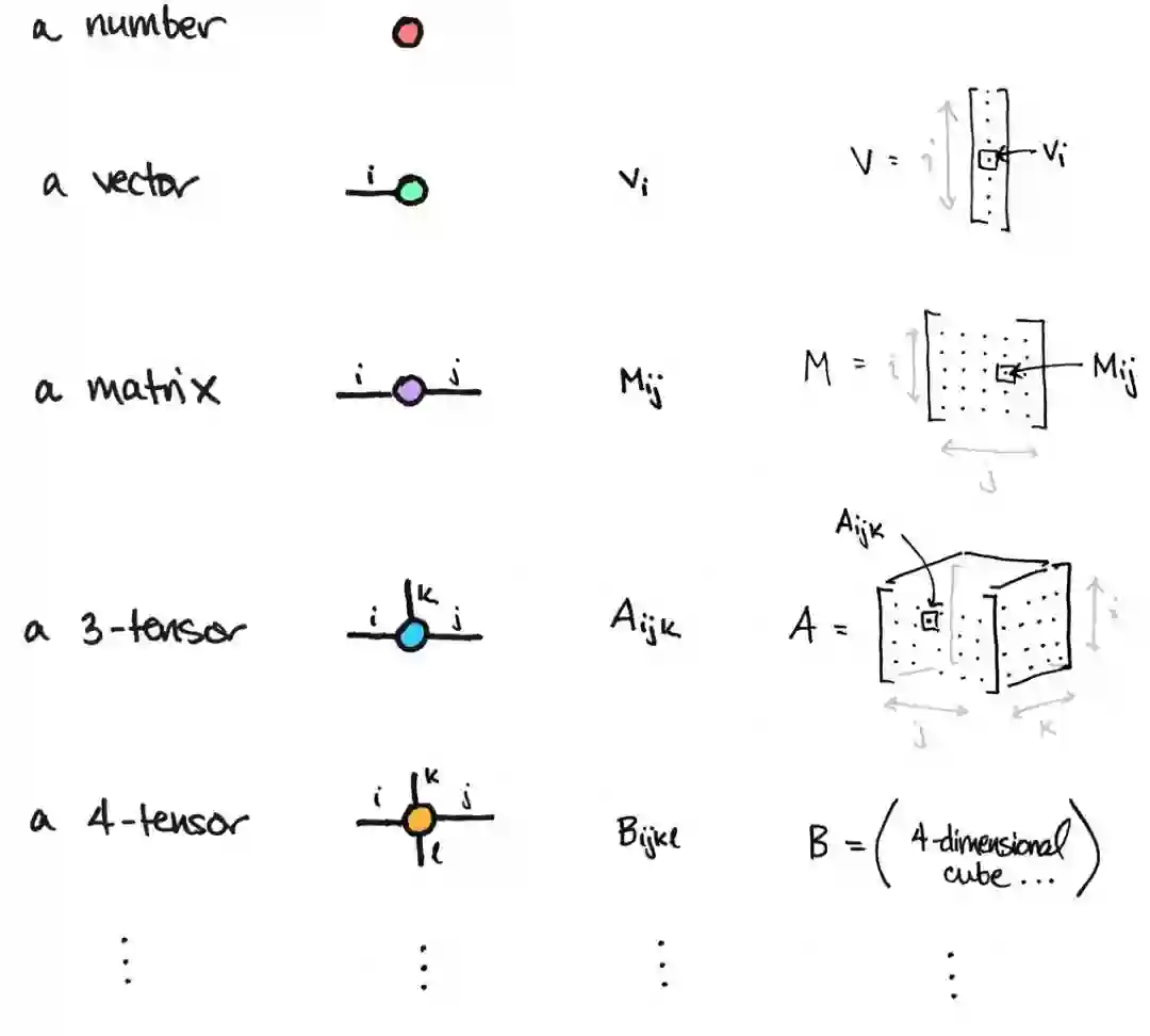 这个想法很容易概括。矩阵是一个二维的数组,而一个 n 维的数组被称为一个 n 阶张量或一个 n-张量。像矩阵一样,一个 n 张量可以用一个节点来表示,每个维度有一个边。