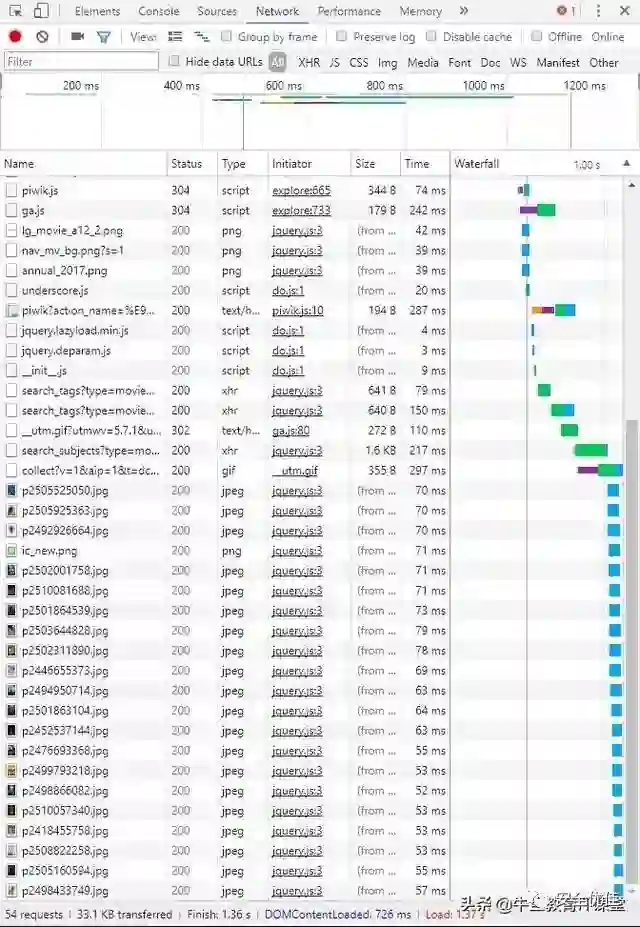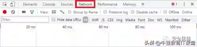 今天我们不再使用左上角的鼠标按钮了,而是使用红色框中的Network,这里显示的是网页加载出来的所有的文件,如下图所示: