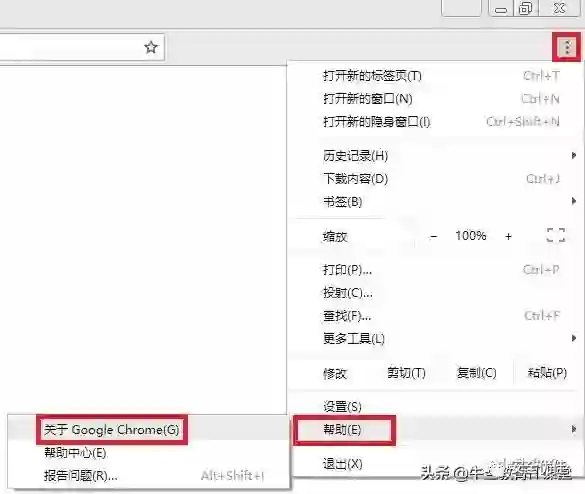首先,我们需要查看自己的谷歌浏览器版本,这个在谷歌的”帮助”中可以查看,具体方法是,打开Chrome,点击右上角的三个点状的按钮,接着在弹出的菜单中依次选择帮助(E) -> 关于 Google Chrome(G)如下图所示: