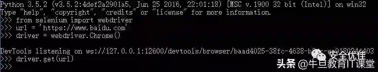到这里,ChromeDriver便完成了安装,我们可以在命令行输入命令python,进入到python交互环境进行测试,如下图所示: