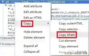 获得元素xpath的方法有几种,最为简单的一种,即在谷歌开发者工具面板上选择要查找的元素,右键选择Copy -> Copy XPath,如下图所示: