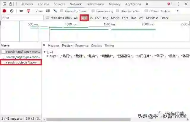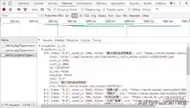 注释3:返回的content经过decode()方法解码,变成了一个字符串类型,根据我们前面的分析,得出这是一个JSON格式的字符串,因此,我们用Python内置的标准库json来进行解析,标准库就不需要用pip工具进行安装了。json模块有两个主要方法———json.loads()和json.dumps(),前一个是用来解码JSON数据的,后一个则是编码成JSON数据的。这里我们主要用到loads()方法,将content解析成一个字典格式的内容,存储在名为content_list的对象里,最后加上“[‘subjects’]”是用来解析出我们要的最简洁的部分,这个根据具体的内容来定,不是所有的解析都要这么写。比如这里,如下图: