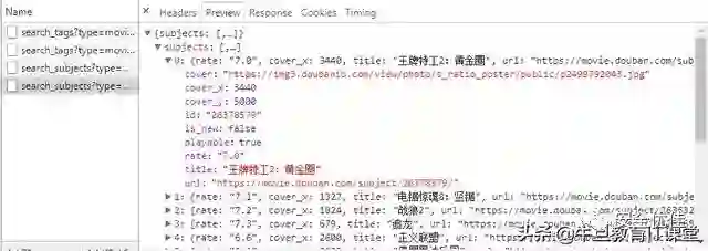 我们要的内容最外面有这么一个嵌套,这个嵌套的Key为”subjects”,这个Key的值为一个数组,这个数组才是我们要的,因此加上了“[‘subjects’]”。