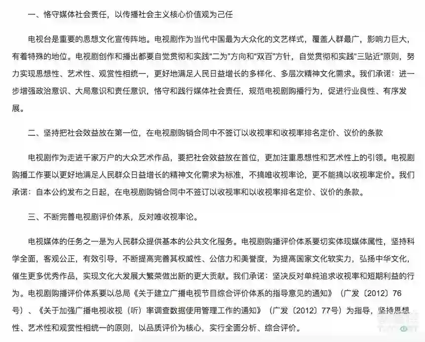 2015年8月,由总局电视剧司倡议,中央电视台和多家省级电视台发起,全国省级及以上电视台共同签署了《恪守媒体社会责任,反对唯收视率自律公约》,其中明确提出来“电视剧购销合同中不签订以收视率和收视率排名定价、议价的条款”,以及“不断完善电视剧评价体系,反对唯收视率论”。