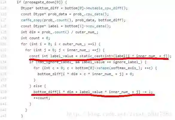132行第一层for循环中的outer_num等于batch size,对于人脸识别和图像分类等单标签分类任务而言,inner_num等于1。如果label从1开始,会导致bottom_diff数组访问越界。