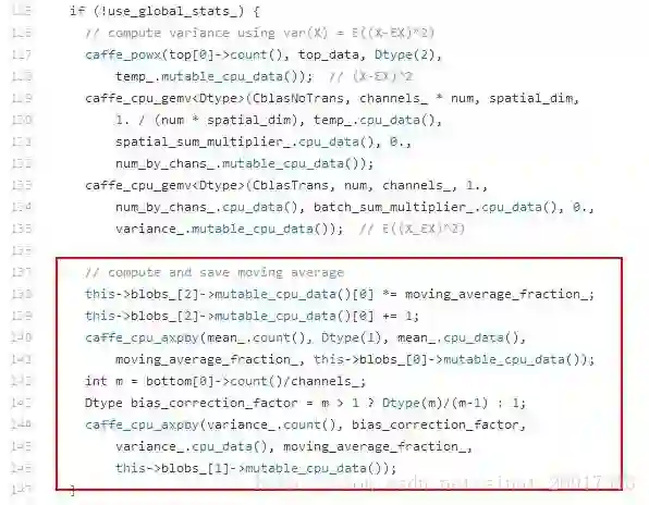 以下代码在use_global_stats为false的时候通过moving average策略计算模型中最终存储的均值和方差: