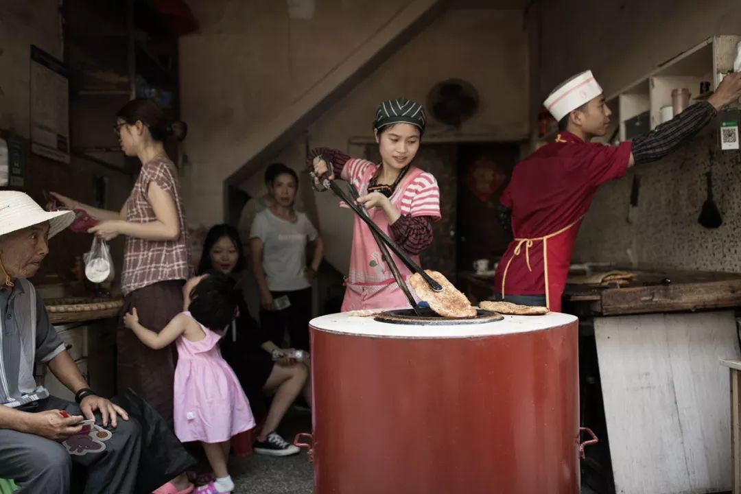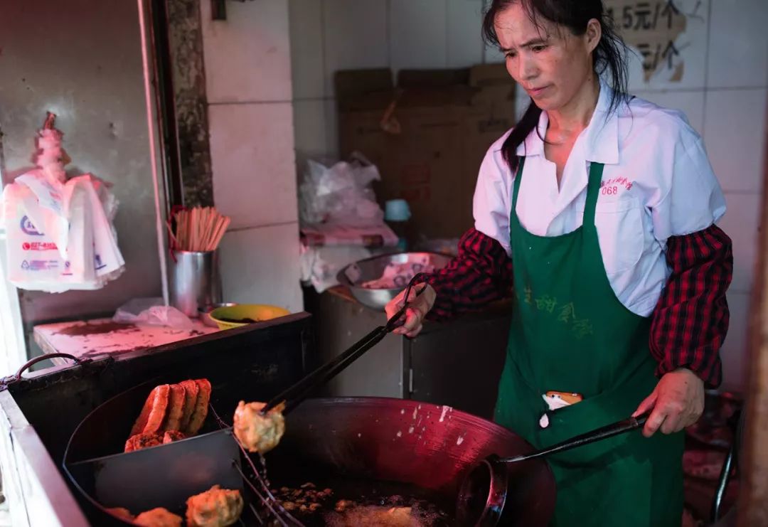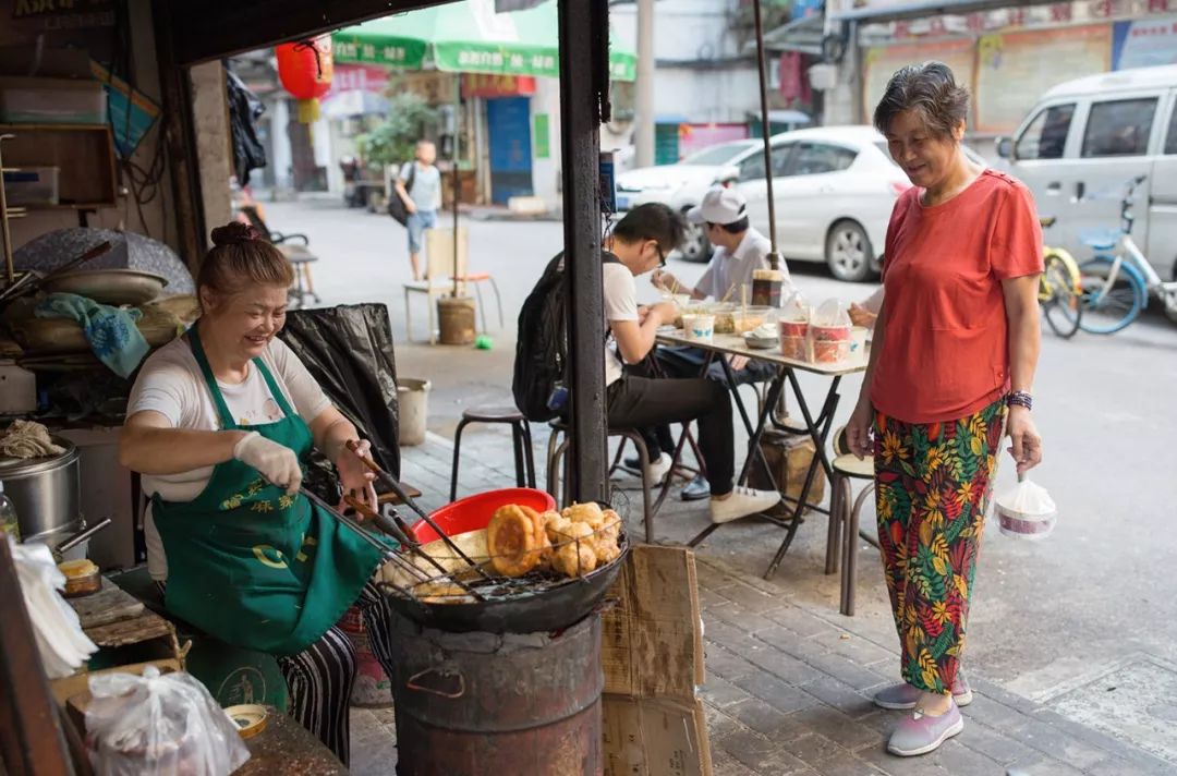 ▲武汉三镇民生甜食馆,衣着入时的女性用竹签串起几个油饼往家里走。武汉人热情而干练,在过早时能充分感受到武汉人的性格特点。