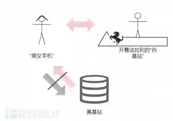 手机姑娘本来跟正经基站小伙处的好好的,这时旁边来了个骗子基站,骗子看起来是个正经小伙,开着法拉利(信号强度高),他向周围的每个姑娘叫喊:“各位姑娘,我是小开,我的法拉利你们也看到了,要跟我走么?” 由于基因(设计)的天性,手机姑娘马上就投入了骗子基站的怀抱…