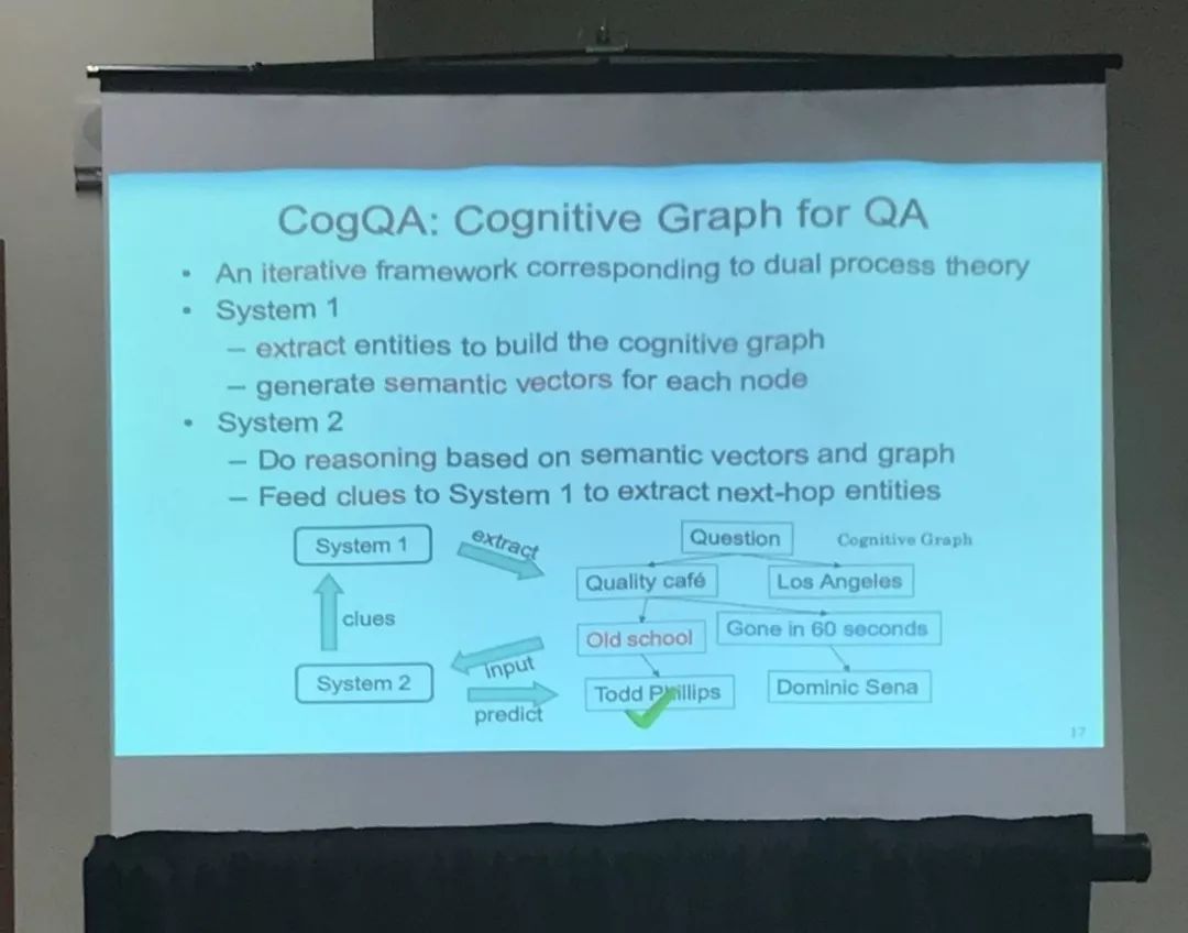 清华大学计算机科学与技术系副主任唐杰教授,做了题为“Knowledge representation and reasoning”的报告,介绍了一种最新的“认知图“(CognitiveGraph)框架,用于知识表征和推理。CognitiveGraph建立在认知科学的双重过程理论之上。