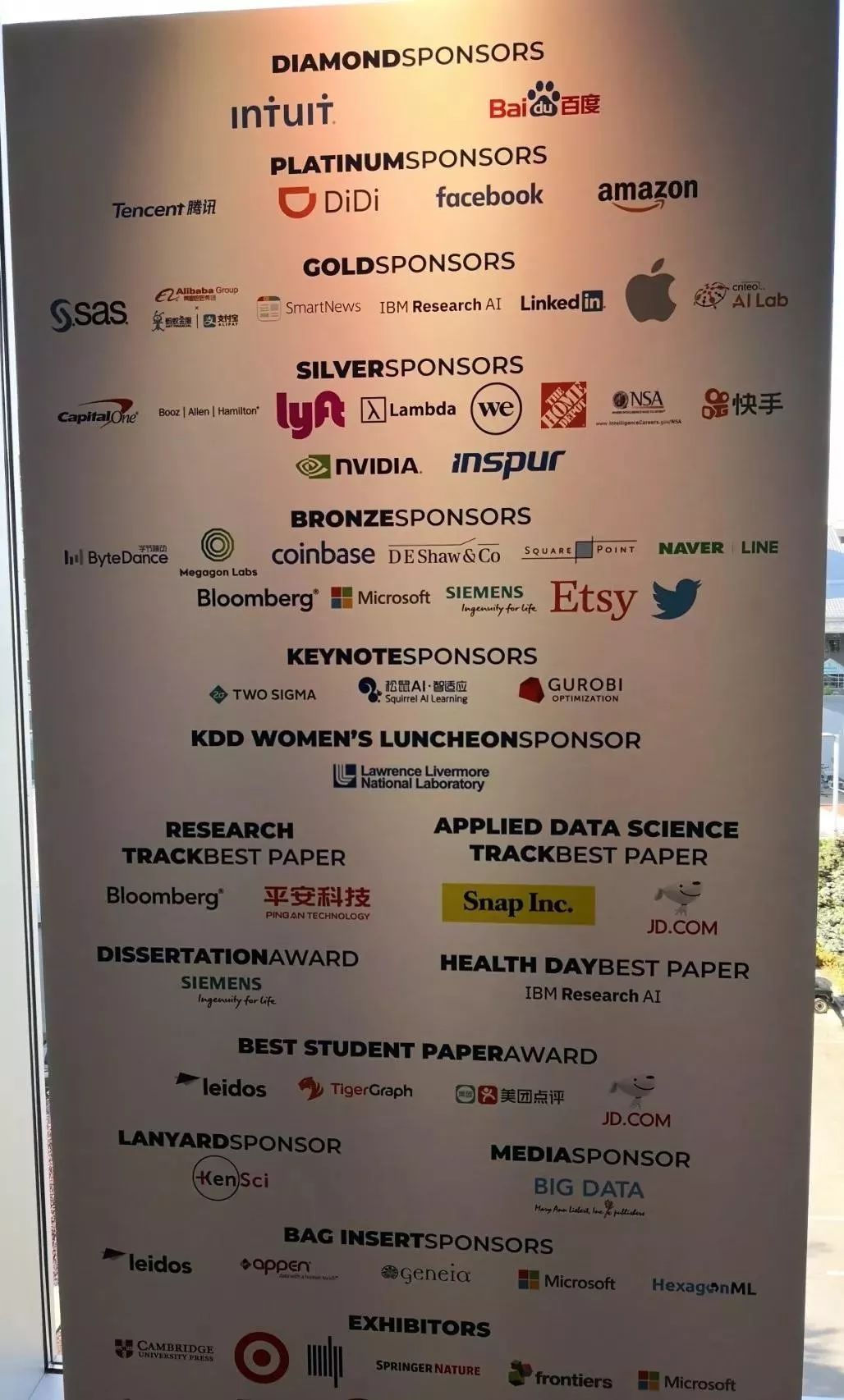 在本界KDD大会上,数据挖掘领域的华人学者担任着重要的角色,其中:KDD China秘书长/京东集团副总裁郑宇博士出席了本次大会的Plenary Keynote Panel;滴滴出行副总裁、滴滴AI Lab负责人叶杰平教授作为Applied Data Science Invited Speakers做了题为Transportation: A Data Driven Approach的演讲;百度研究院商业智能实验室主任,罗格斯大学熊辉教授担任大会·的Applied Data Science Invited Talk Chair,字节跳动人工智能实验室总监李磊担任了本次大会的Sponsorship Chair。